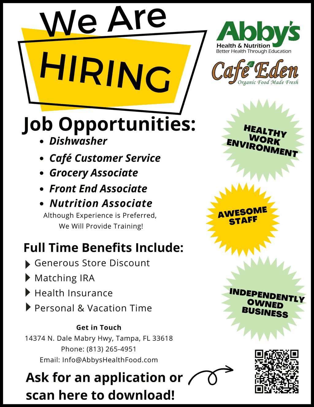 Coming to work at Abby’s is more than just a job. It’s a place where you can share your knowledge and passions with others, while truly making a difference in our community. While experience is always a plus, we pride ourselves on hiring go-getters, people who enjoy working in a fast-paced environment and those who are eager to learn.