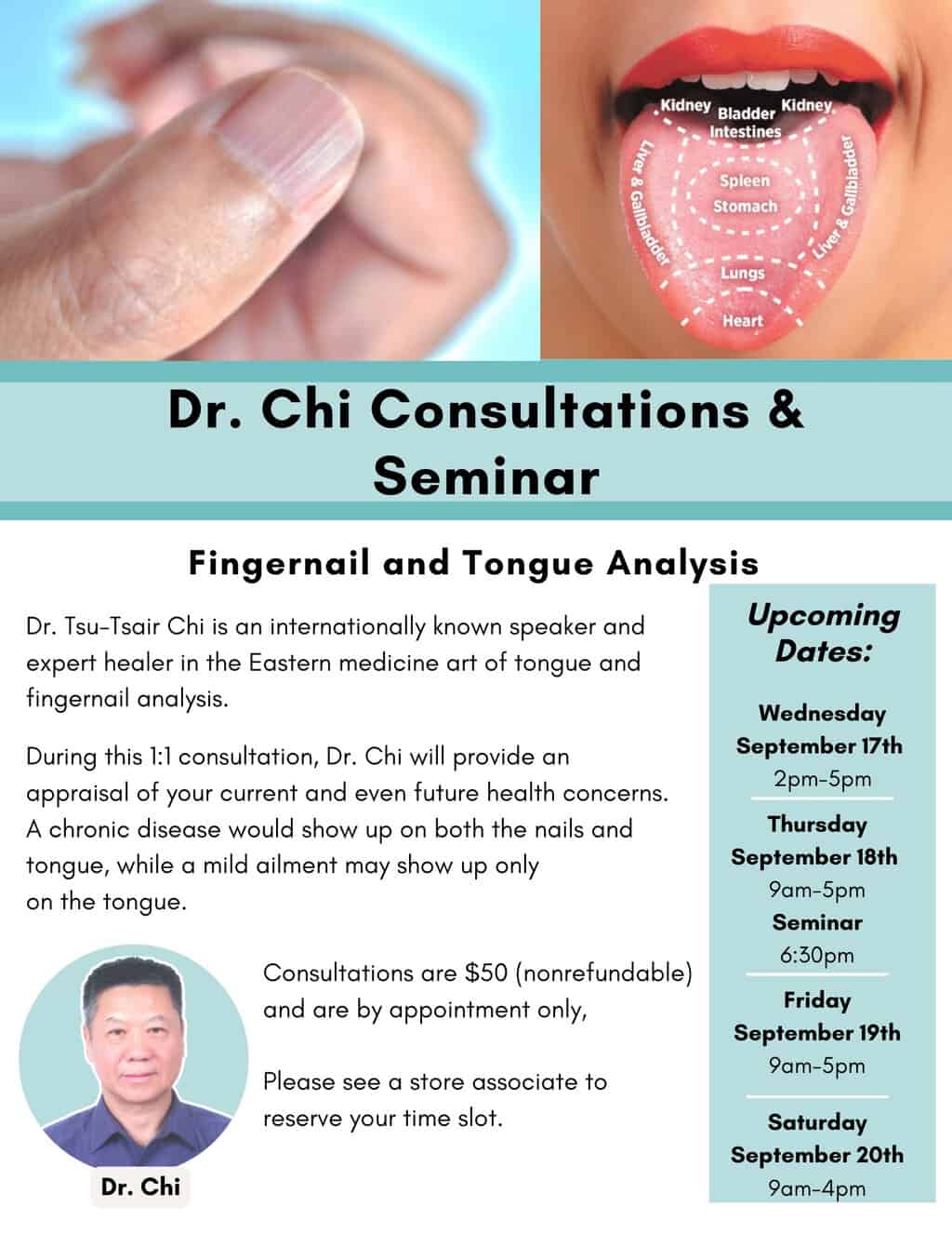 Dr. Chi will also be having 1:1 consultations available on Wednesday, September 17th, through the 20th. Please see a store associate to reserve your time slot.