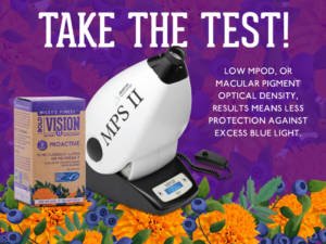 What’s your MPOD score? In less than 90-seconds, the MPOD (macular pigment optical density) machine measures the health of the macula in your eyes. A lower MPOD score means greater risk for eye damage from exposure to the blue light in our phones, tablets, computers, flat screen TVs, even natural sunlight. A higher MPOD score means greater protection from blue light damage, as well as less eye strain, better night driving vision, and clearer vision as we age. That’s good news! What’s even better is you can increase your MPOD score by consuming more lutein and zeaxanthin! Lutein and zeaxanthin are crucial nutrients for your eye health; they improve the health of your macula. Lutein and zeaxanthin work like internal sunglasses for your eyes.